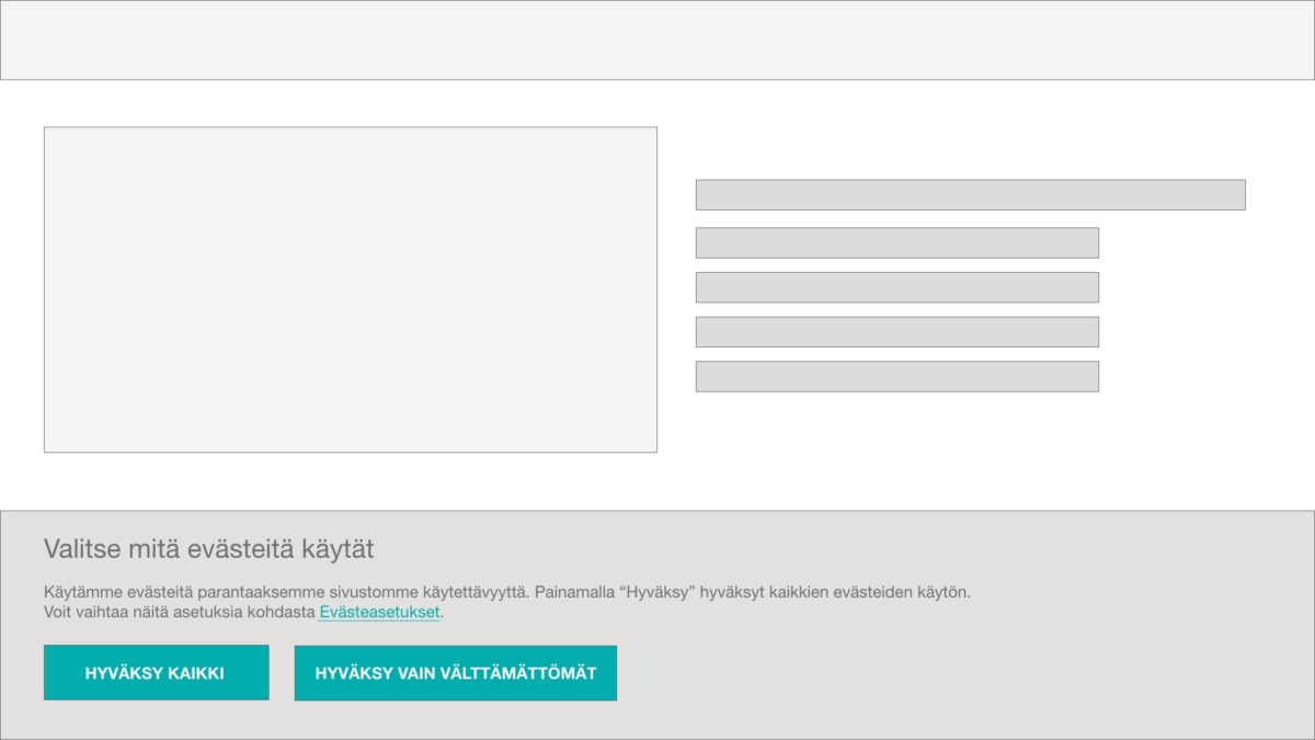 Tällä hetkellä monilla on siis edelleen vanhan käytännön mukaiset evästeilmoitukset käytössä. Niissä voi yhdellä klikkauksella hyväksyä kaikki evästeet, mutta muun valinnan tekeminen vaatii viitseliäisyyttä. Vaatimus, jonka mukaan ei-välttämättömistä evästeistä kieltäytymisen on oltava yhtä helppoa kuin kaikkien evästeiden hyväksyminen, näyttää käytännössä tältä: