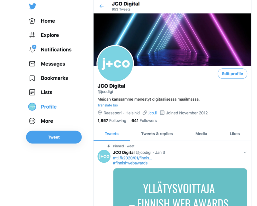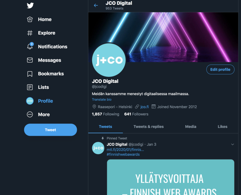 JCO:lle Grand Prix ja yleisövoitto Finnish Web Awardsissa