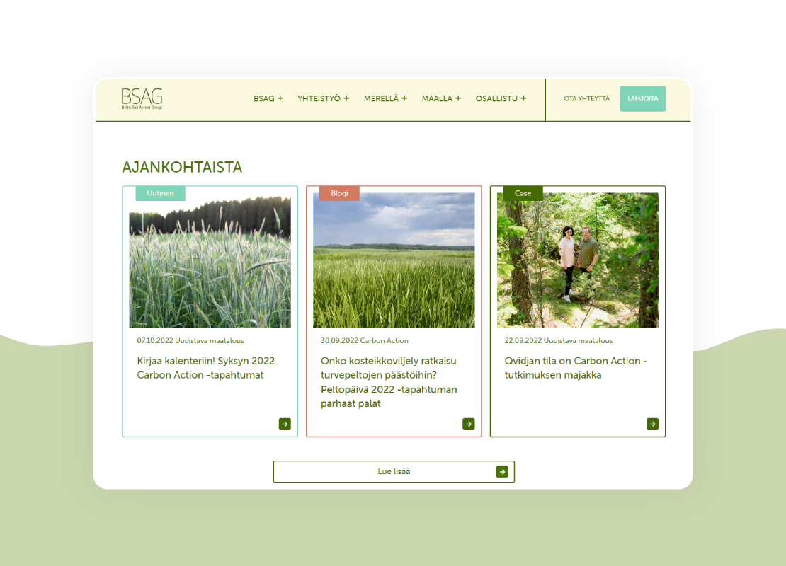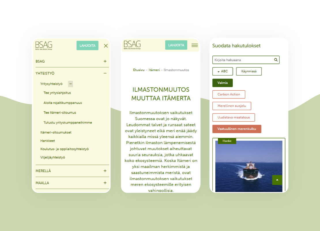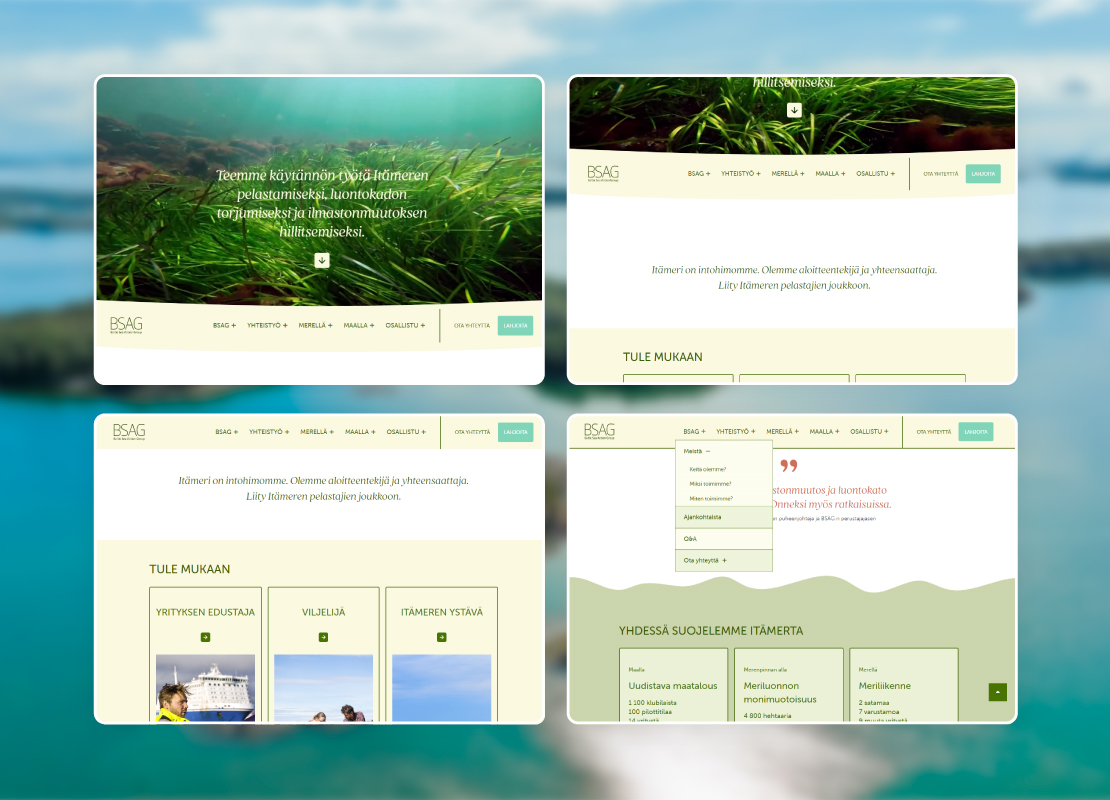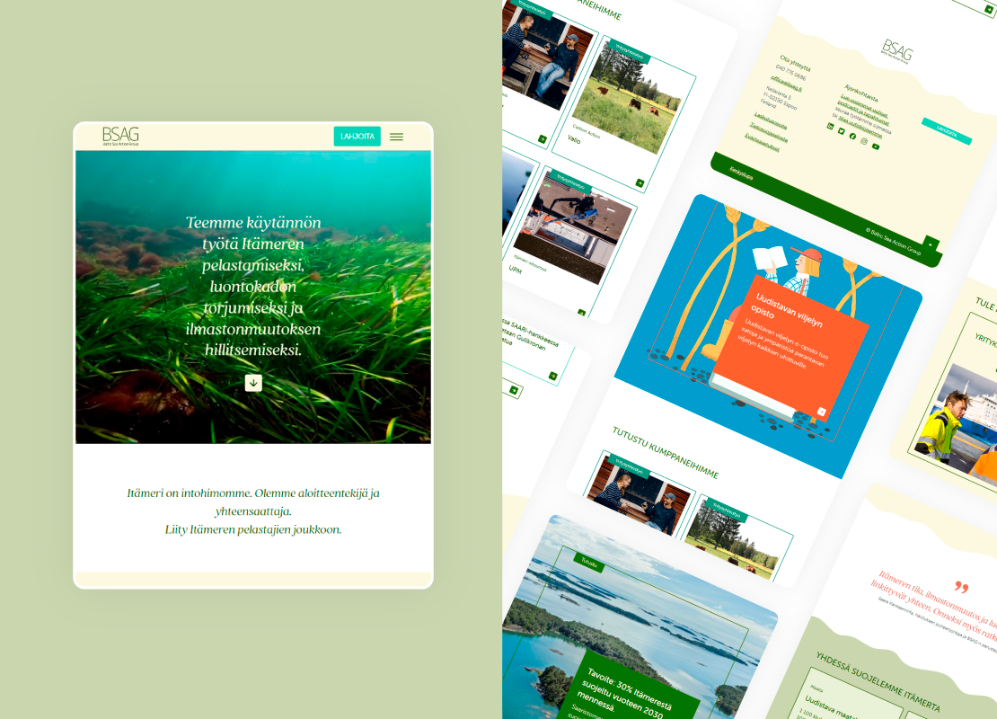Baltic Sea Action Group eli BSAG on voittoa tavoittelematon säätiö, joka tekee tärkeää työtä Itämeren pelastamiseksi. Verkkosivu-uudistuksen lähtökohtana oli päivittää vanha sivusto vastaamaan paremmin nykyaikaisia vaatimuksia sekä tarjoamaan käyttäjilleen entistä parempi käyttäjäkokemus. Tärkeänä tarvoitteena oli myös päivittää verkkokauppa sekä kehittää aineettoman lahjan antamisen mahdollisuutta. Sivuston visuaalisesta ulkonäöstä vastasi BSAG:n oma suunnittelija.