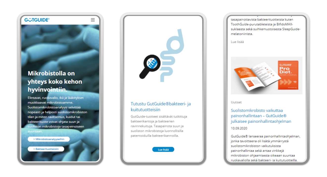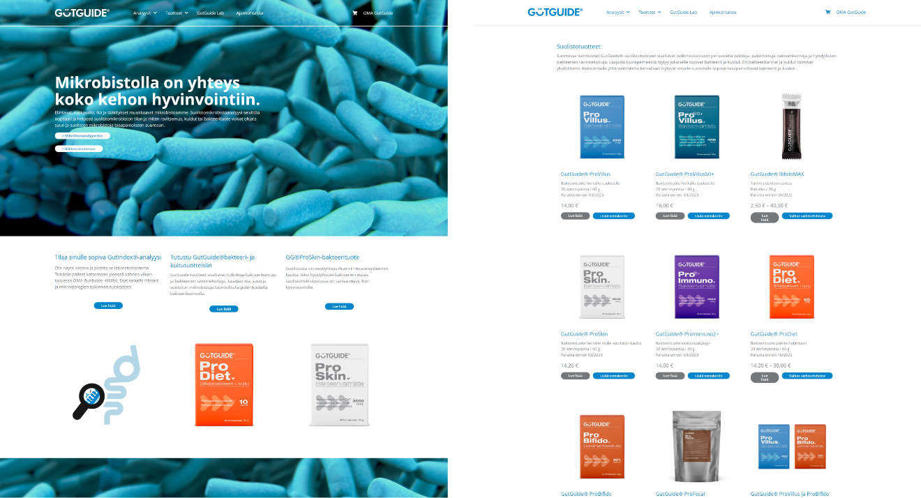 GutGuide, suomalainen mikrobiologinen analyysipalveluja tarjoava yritys, halusi päivittää ja parantaa olemassa olevaa verkkopalveluaan. Tavoitteena oli luoda moderni ja käyttäjäystävällinen alusta, joka mahdollistaisi suolistobakteeri- ja mikrobistoanalyysien sekä muiden suoliston hyvinvointituotteiden tilaamisen entistä helpommin ja luotettavammin.