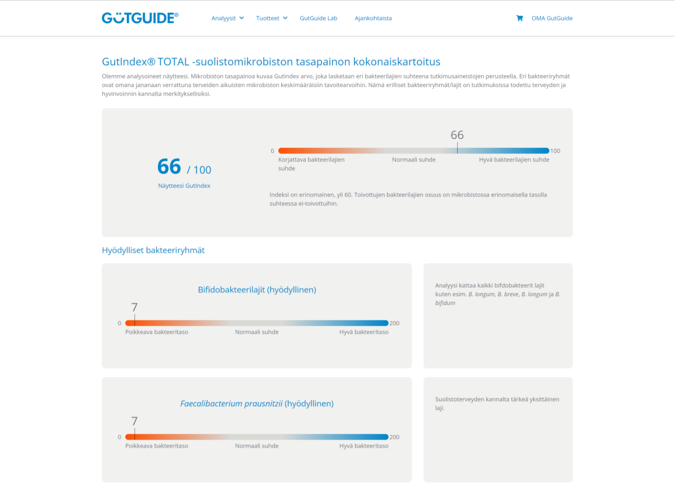 Suunnittelimme ja toteutimme GutGuiden uuden verkkokaupan WordPressin ja WooCommercen päälle. Uudistettu verkkopalvelu sisältää selkeät tuotekategoriat ja kattavat tuotekuvaukset, mikä helpottaa asiakkaiden navigointia ja päätöksentekoa. Verkkokaupassa asiakkaat voivat tilata suolistomikrobiston analyysejä, kuten GutIndex®BENE-analyysin, ja saada tulokset henkilökohtaiselle OMA GutGuide -tililleen. Näytteenottoprosessi on tehty mahdollisimman helpoksi, ja analyysitulokset ovat saatavilla noin kahden viikon sisällä. Uusi verkkopalvelu parantaa asiakaskokemusta, lisää GutGuiden näkyvyyttä ja tekee analyysipalveluiden tilaamisesta ja tulosten tarkastelusta vaivatonta.
