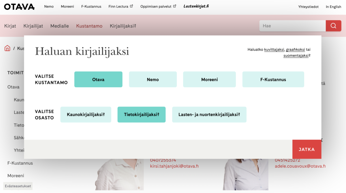 WordPress-alustalle rakennettiin sivusto, jossa keskeisin osa on laaja kirjahaku. Sivustolle rakennettiin monenlaisia uusia toimintoja ja kokonaan uusi käsikirjoituspankki. Uudistuksen yhteydessä tehtiin myös omat etusivut Otavaan kuuluville kustantamoille eli Nemolle, Moreenille ja F-Kustannukselle.