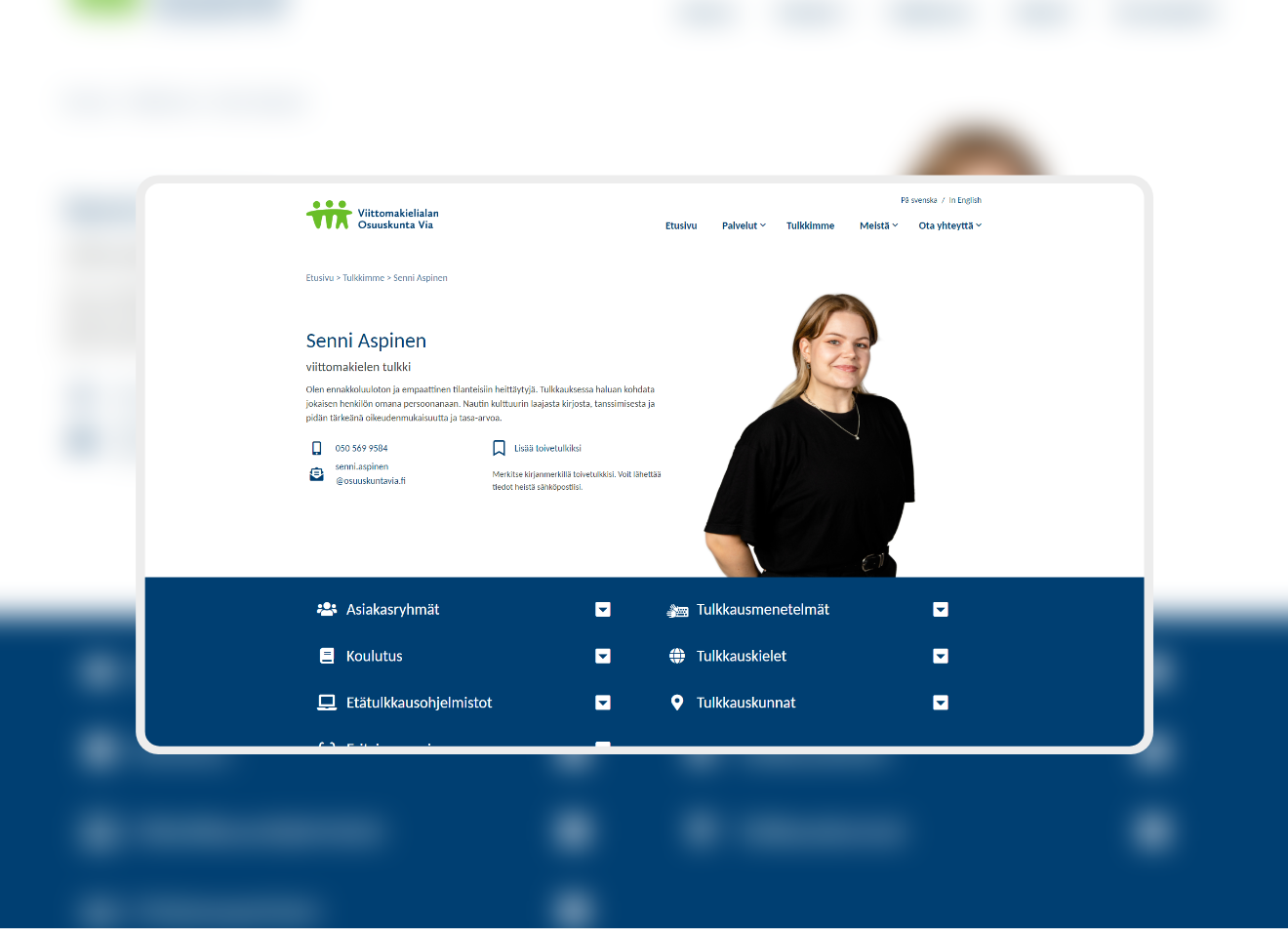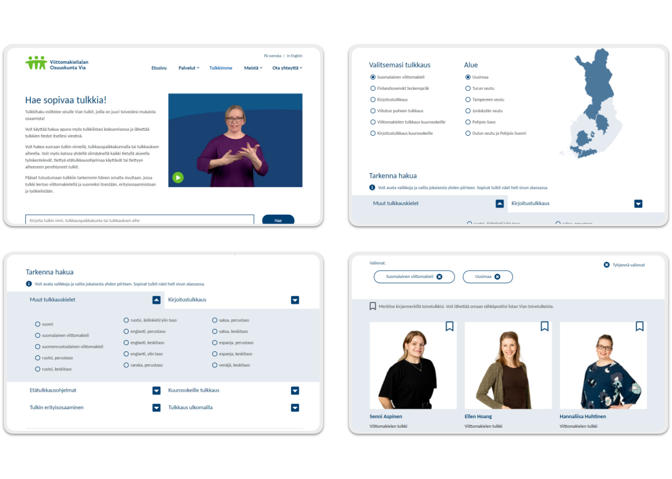 Viittomakielialan Osuuskunta Vialle haluttiin selkeät ja saavutettavat verkkosivut. Sadan tulkin joukosta tulisi helposti löytää omiin tarpeisiin sopiva tulkki. Osumat sopivista tulkeista tulisi pystyä tallentamaan ja lähettämään sähköpostiin.