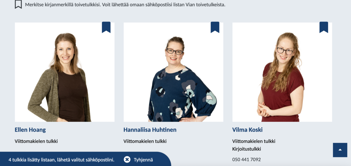 Asiakkaan briiffi/visio kiteytettynä: Selkeät ja saavutettavat verkkosivut. Sadan tulkin joukosta tulisi helposti löytää omiin tarpeisiin sopiva tulkki. Osumat sopivista tulkeista tulisi pystyä lähettämään sähköpostiin.
