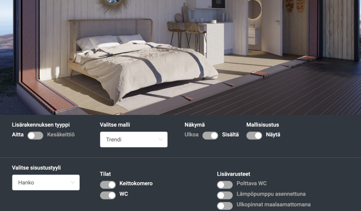 Ratkaisu: Verkkopalvelu, jossa kävijä pääsee työkalun avulla suunnitteleman mieleisensä aitan tai kesäkeittiön. Suunnittelutyökalulla voi katsoa eri malleja sekä ulkoa että sisältä, mutta myös vaihtaa eri sisustustyylejä. Työkalu näyttää reaaliajassa yhdistelmän hinnan.